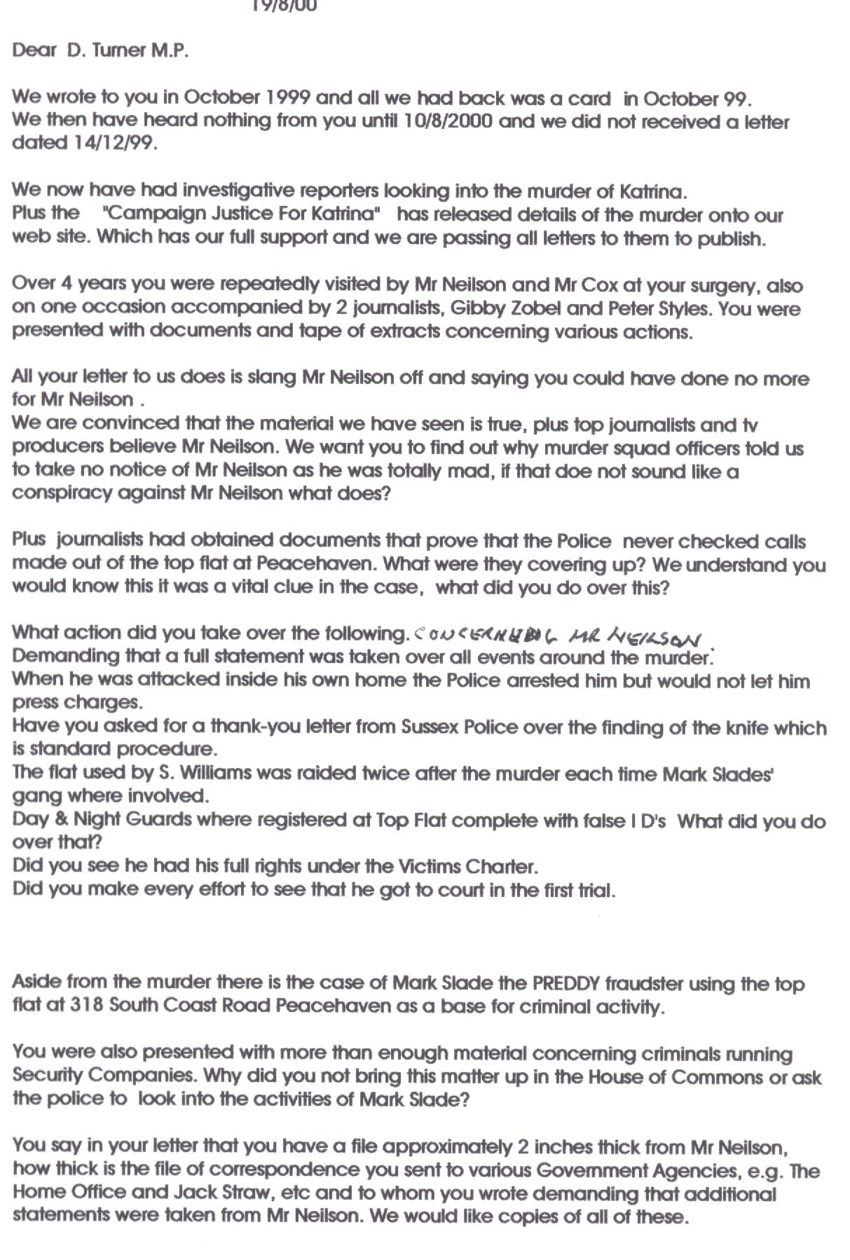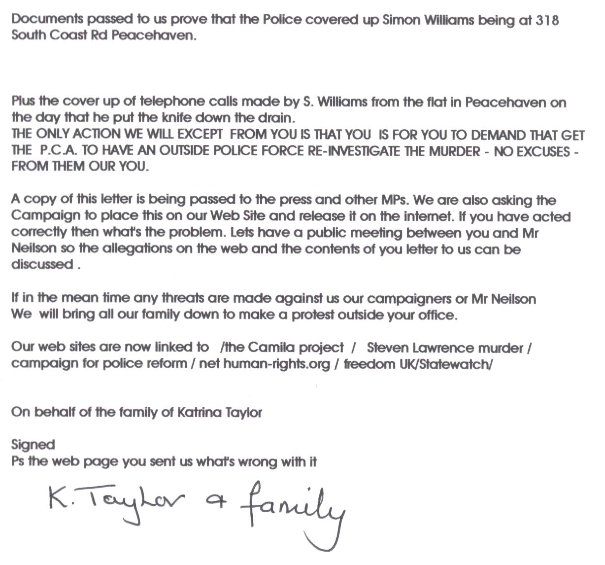 THE TAYLOR FAMILY REPLY TO DES TURNERS LYING LETTER OF THE 10/8/2000